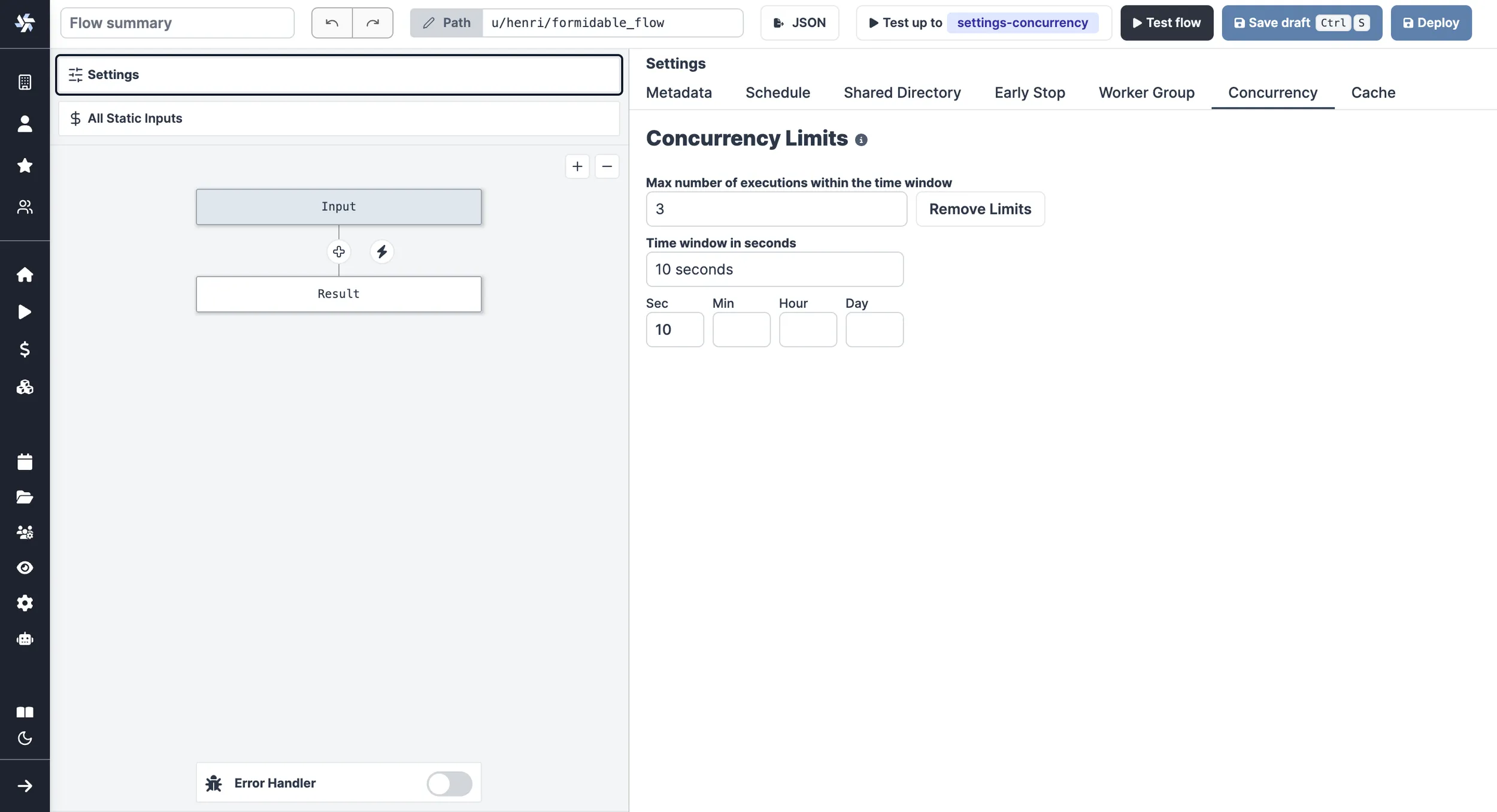 The Concurrency limits feature allows you to define concurrency limits for scripts, flows and inline scripts within flows. Its primary goal is to prevent exceeding the API Limit of the targeted API, eliminating the need for complex workarounds using worker groups.