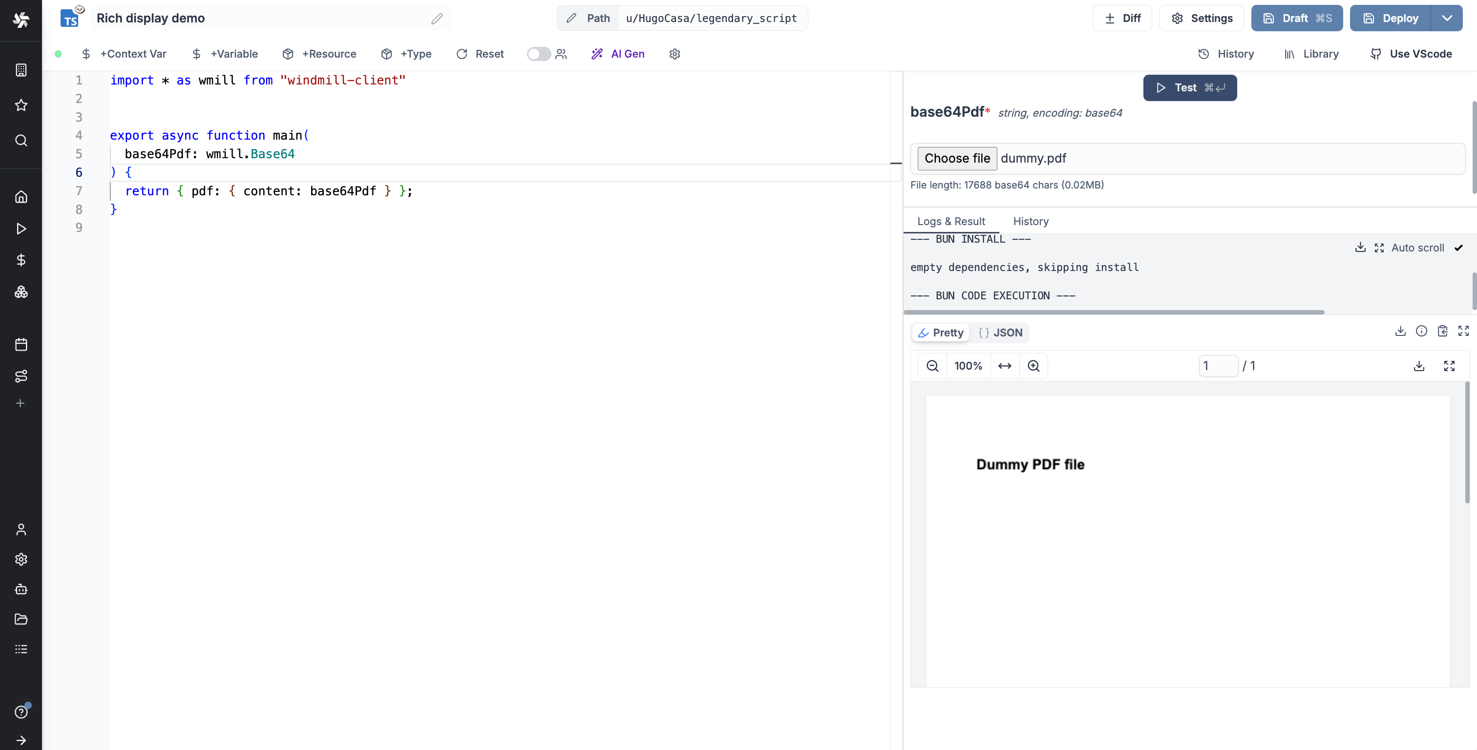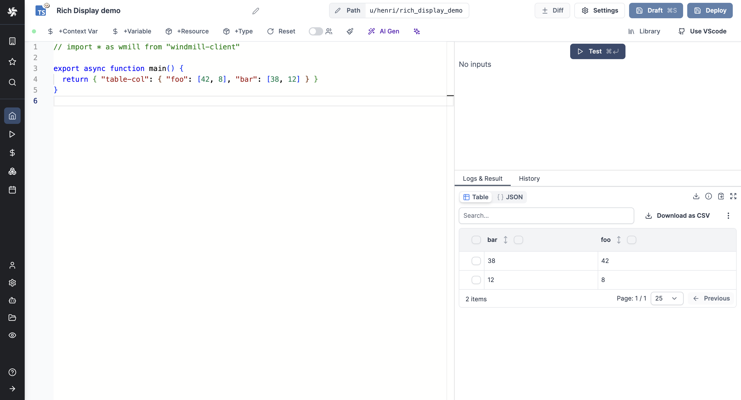 Windmill processes some outputs (from scripts or flows) intelligently to provide rich display rendering, allowing you to customize the display format of your results.