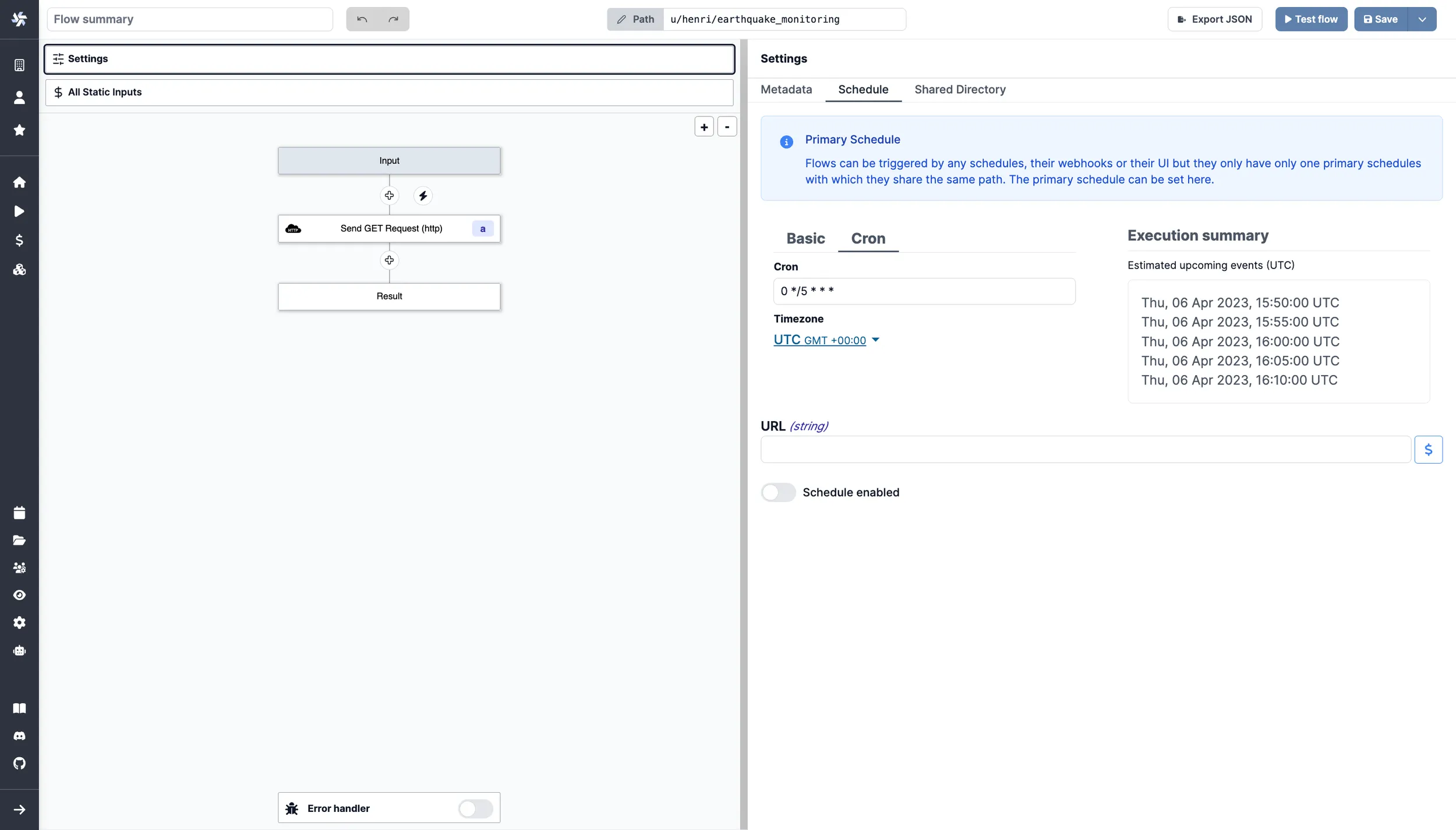 Windmill provides the same set of features as CRON, but with a user interface and control panels. It allows you to define Schedules for Scripts and Flows. Once a schedule is defined, the script will automatically run at the set frequency. Think of it as an easy-to-use scheduler similar to CRON that you can share with other users.
